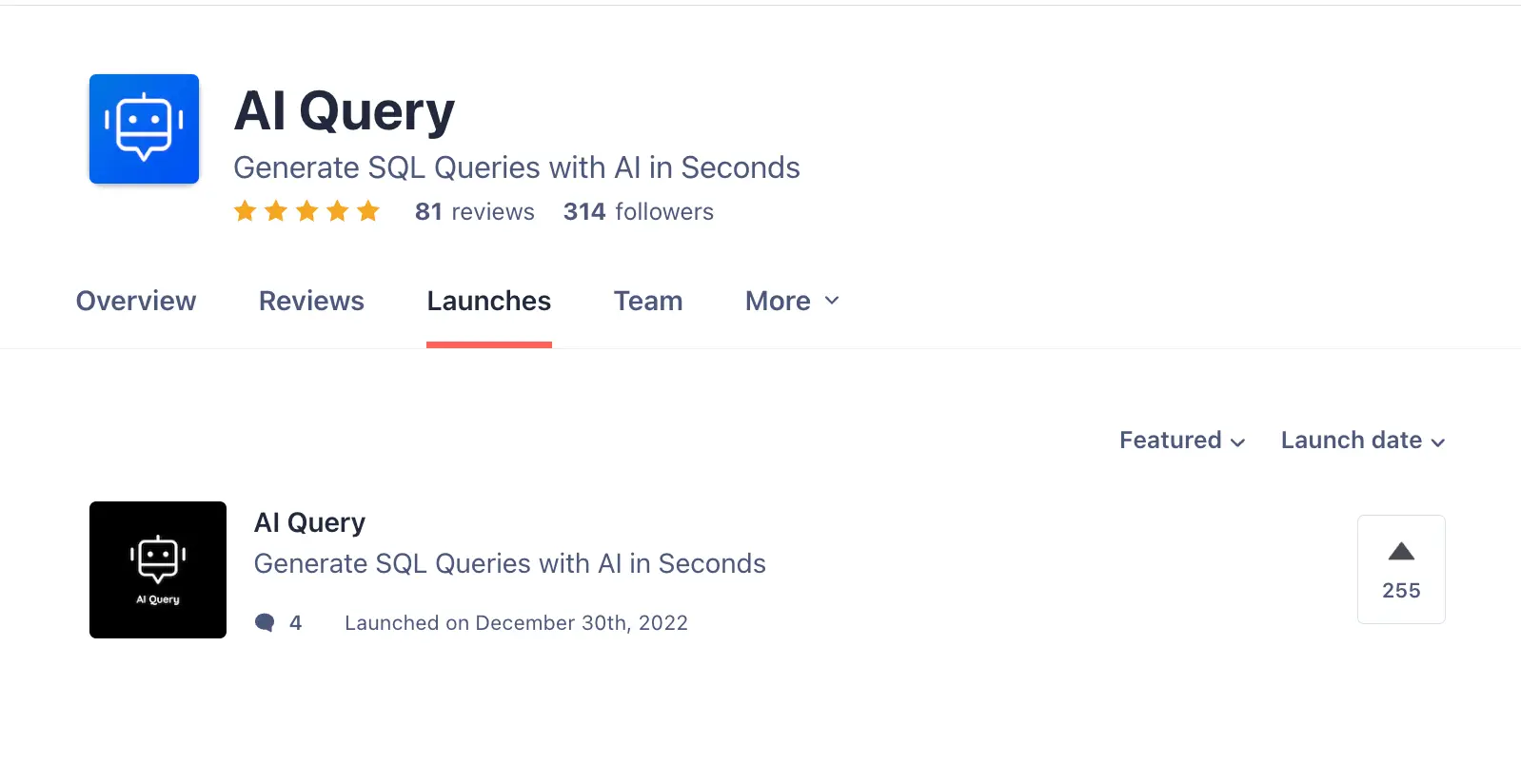 AI Query was launched on Product Hunt just one month after ChatGPT was released (at the end of November 2022).